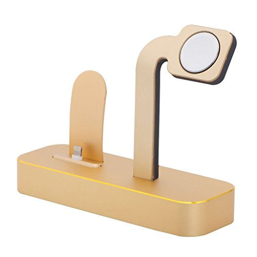 Apple Watch Stand, [UniqueKay] 2-1 Premium Aluminum Charging Dock Station Stand Holder for Apple Watch Series 1 Apple Watch Series 2 & iPhone 7 / 7plus 5/ 5S/ 6/ 6 Plus (Gold)